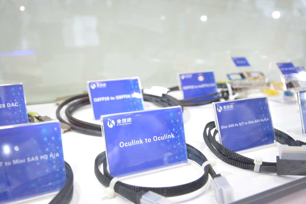 在數據中心應用上,金信諾展出了内部線端GEN-Z、slim SAS、Mini SAS HD 等組件産品以及外部線端SFP+、SFP28、QSFP28、QSFP56等組件産品。内部線端産品可以無縫從當下主流的PCLe4.0演進到PCIe5.0及6.0,同時能夠匹配Inter、Arm及Amd架構下的互聯互通;外部線端産品如QSFP28及ACC産品在新一代互聯網架構中能夠極好的滿足100G、200G 及400G傳輸需求。此外,上述相關産品金信諾均有自主專利且實現整體材料國産化。