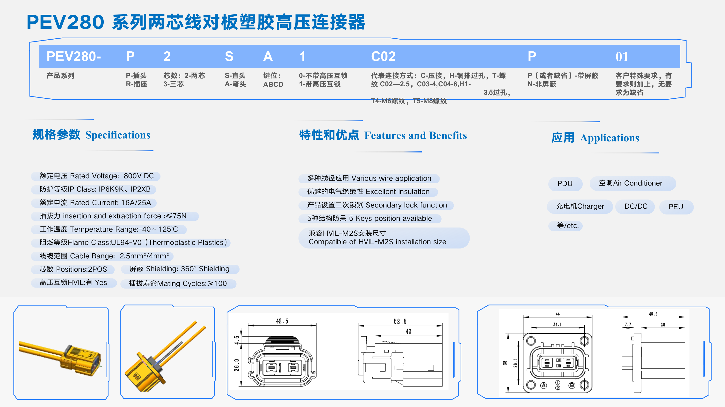 PEV280 系列兩芯線對闆塑膠高壓連接器