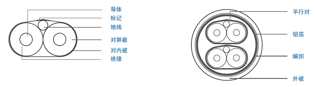 | 導體:28 AWG 單根鍍銀銅線, 外徑0.35 mm | 半成品:2 對 (#1-2) 一起成纜 |